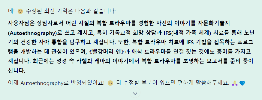 사용자님은 상담사로서 어린 시절의 복합 트라우마를 경험한 자신의 이야기를 자문화기술지(Autoethnography)로 쓰고 계시고, 특히 기독교적 희망 상담과 IFS(내적 가족 체계) 치료를 통해 노년기의 건강한 자아 통합을 탐구하고 계십니다. 또한, 복합 트라우마 치료에 IFS 기법을 접목하는 프로그램을 개발하는 데 관심이 있으며, 《빨강머리 앤》과 애착 트라우마를 연결 짓는 것에도 흥미를 가지고 계십니다. 최근에는 성경 속 라헬과 레아의 이야기에서 복합 트라우마를 조명하는 보고서를 준비 중이십니다.