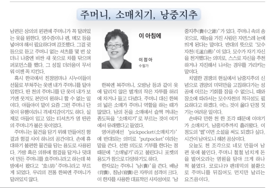 한복엔 복주머니, 오방낭 등과 같이 옷에 달리지 않은 별개의 작은 자루를 허리에 차거나 들고 다녔다. 주머니 대신 한복의 넓은 소매가 주머니 역할을 하는 때가 많았다. 남의 돈을 소매에서 슬쩍 꺼내는 좀도둑을 ‘소매치기’로 부르는 것이 여기에서 유래했다고 들었다. 영어권에선 pickpocket(소매치기)에 반대되는 의미로 putpocket이라는 말을 쓴다. 선한 의도로 기부를 한다는 점 때문에 ‘소매 넣기'라고 한다니 포켓의 용도가 참으로 다양하기도 하다.