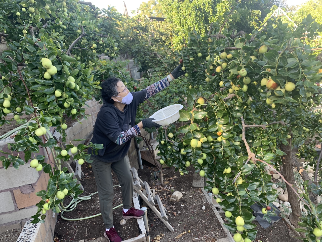 따러 오라는 연락을 받고 흥분하여 잠까지 설치셨다는 헬렌 여사는 모자 쓰고 장갑 끼고 들떠서 오셨다. 위쪽에 익은 것이 많아 높은 곳은 남편이 따주고, 손맛을 느끼고 싶으시다는 그분은 나무 아래쪽 열매를 땄다가 땅에 떨어진 걸 주웠다가 어쩔 줄을 모르신다.