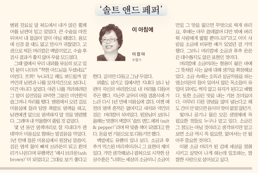 백발에도 유행이 있나 보다. 소금과 후추가 믹스된 머리색이라니 그 표현이 재미있다. 가만 생각해보니 팔복으로 시작한 산상수훈은 “너희는 세상의 소금이니 소금이 만일 그 맛을 잃으면 무엇으로 짜게 하리오 후에는 아무 쓸데없어 다만 밖에 버리워 사람에게 밟힐 뿐이니라”라고 이미 사람을 소금에 비유한 예가 있었던 걸 기억했다. 그러니 머리칼에 소금과 후추 운운은 대수롭지도 않은 표현인 것이다.
