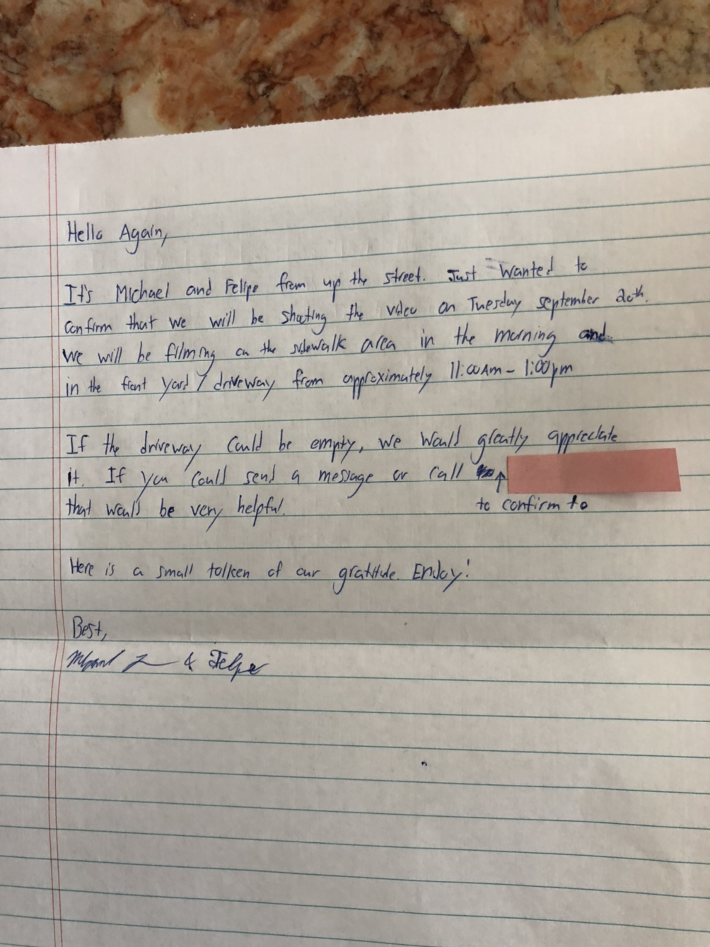 지난주에 새로 이사 온 집 아들 펠리페(Felipe)가 우리 연못과 현관을 비디오로 찍고 싶다고 들렀다. 비디오 프로젝트를 친구와 함께 한다고 해서 오케이 했다. 주일 저녁 교회에서 돌아오는데 현관 앞에 편지와 와인이 놓여있다. 글씨도 괴발개발에 스펠도 틀렸다. 요즘애들의 수준이다. 화요일 촬영을 컨펌한다는 내용이다.