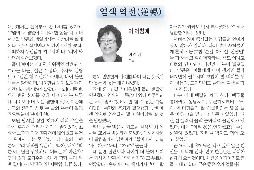 서비스업에 종사하는 사람들의 언어가 있지 않은가 말이다. 나이 많은 사람들에게 흔히 쓰는 호칭 ‘손님, 어르신, 선생님’을 다 놔두고 할아버지라니. 욕도 아니고 비하의 단어도 아니건만 기분이 별로였다. 남편은 “아들에게 아이 생기면 할아버지인데 뭘” 하며 호칭에 별 의미를 두지 않는다. 그러면서도 남편은 염색을 다시 시작했다.