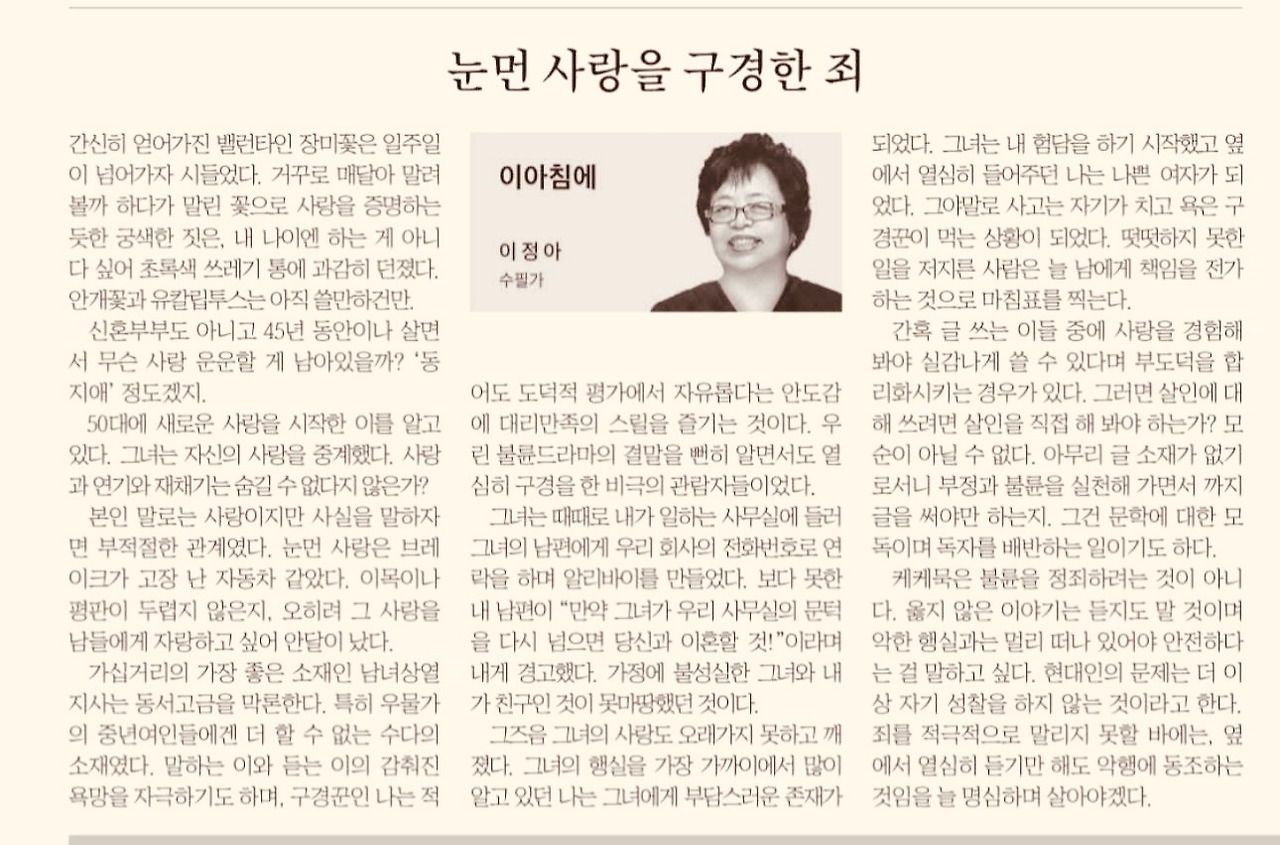 간혹 글 쓰는 이들 중에 사랑을 경험해 봐야 실감 나게 쓸 수 있다며 부도덕을 합리화시키는 경우가 있다. 그러면 살인에 대해 쓰려면 살인을 직접 해 봐야 하는가? 모순이 아닐 수 없다. 아무리 글 소재가 없기로서니 부정과 불륜을 실천해 가면서 까지 글을 써야만 하는지. 그건 문학에 대한 모독이며 독자를 배반하는 일이기도 하다.