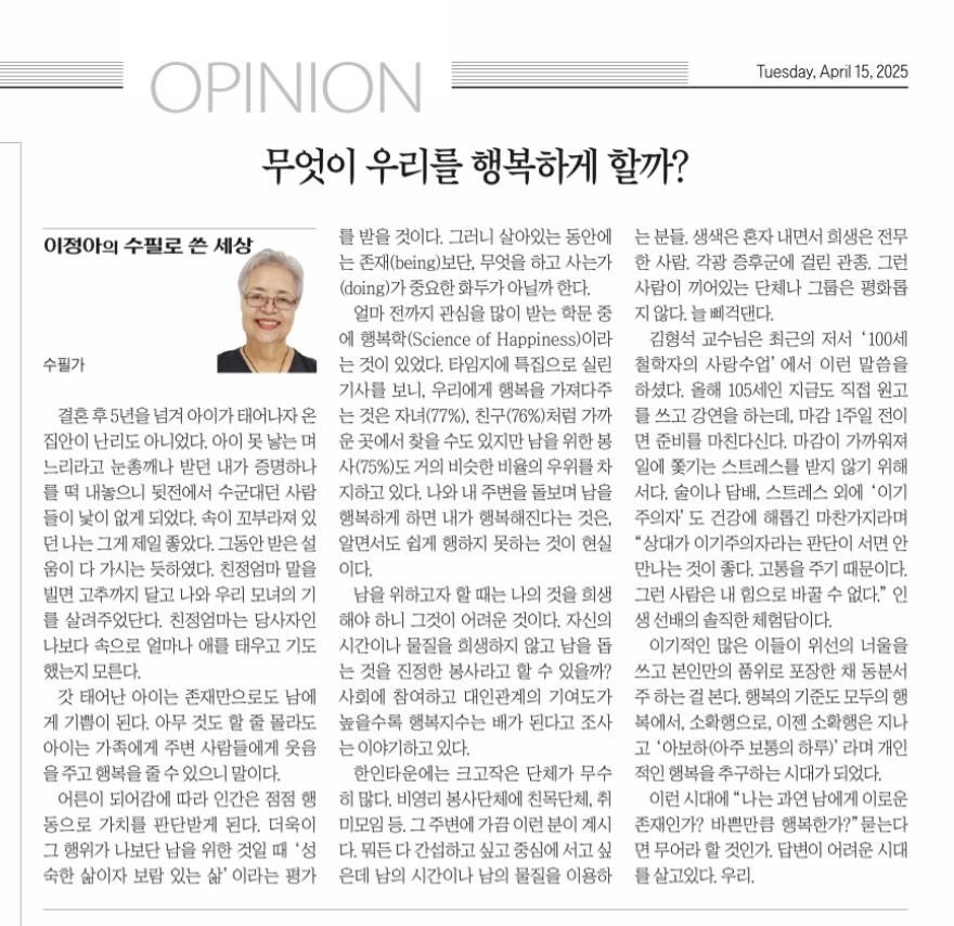 #조선일보 미주판 4월 15일 2025년 , ‘이정아의 수필로 쓴 세상‘