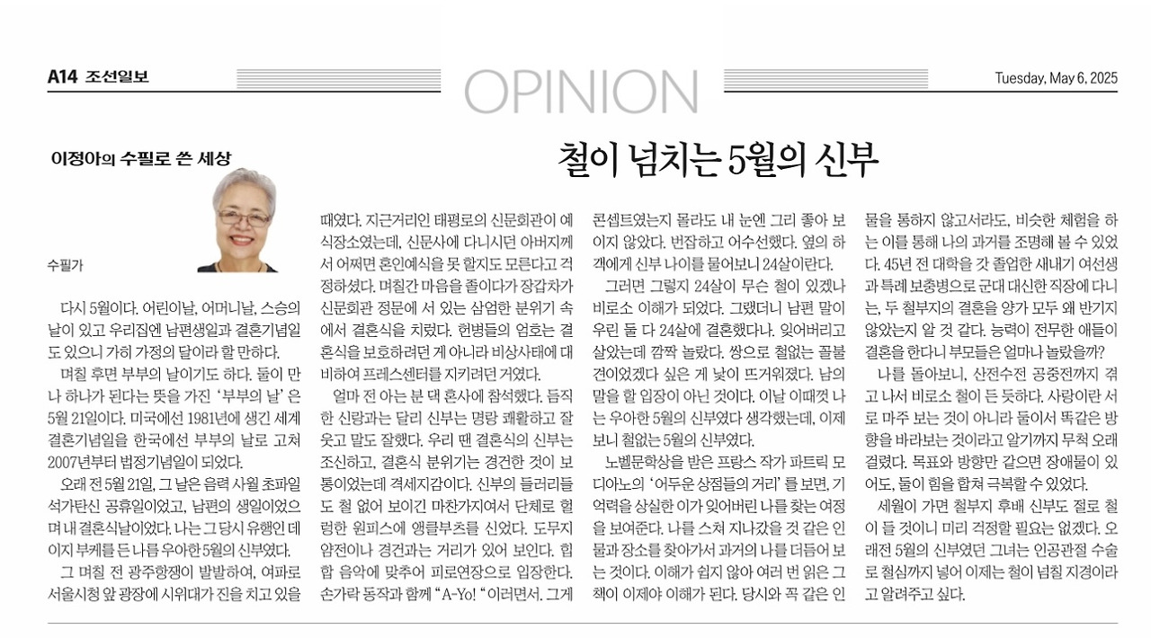 세월이 가면 철부지 후배 신부도 절로 철이 들 것이니 미리 걱정할 필요는 없겠다. 오래전 5월의 신부였던 그녀는 인공관절 수술로 철심까지 넣어 이제는 철이 넘칠 지경이라고 알려주고 싶다.