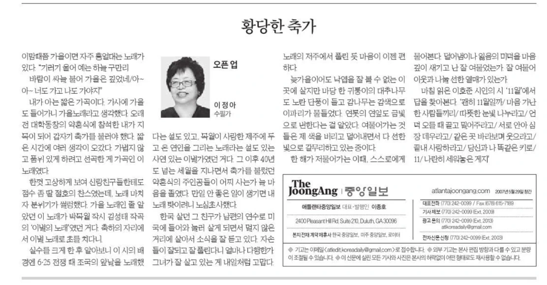 한국 살던 그 친구가 남편의 연수로 미국에 들어와 눌러살게 되면서 멀지 않은 거리에 살아서 소식을 잘 듣고 있다. 자손들이 잘되고 잘 풀린다니 얼마나 다행한가. 그녀가 잘 살고 있는 게 내일처럼 고맙다. 노래의 저주에서 풀린 듯 마음이 이젠 편하다.