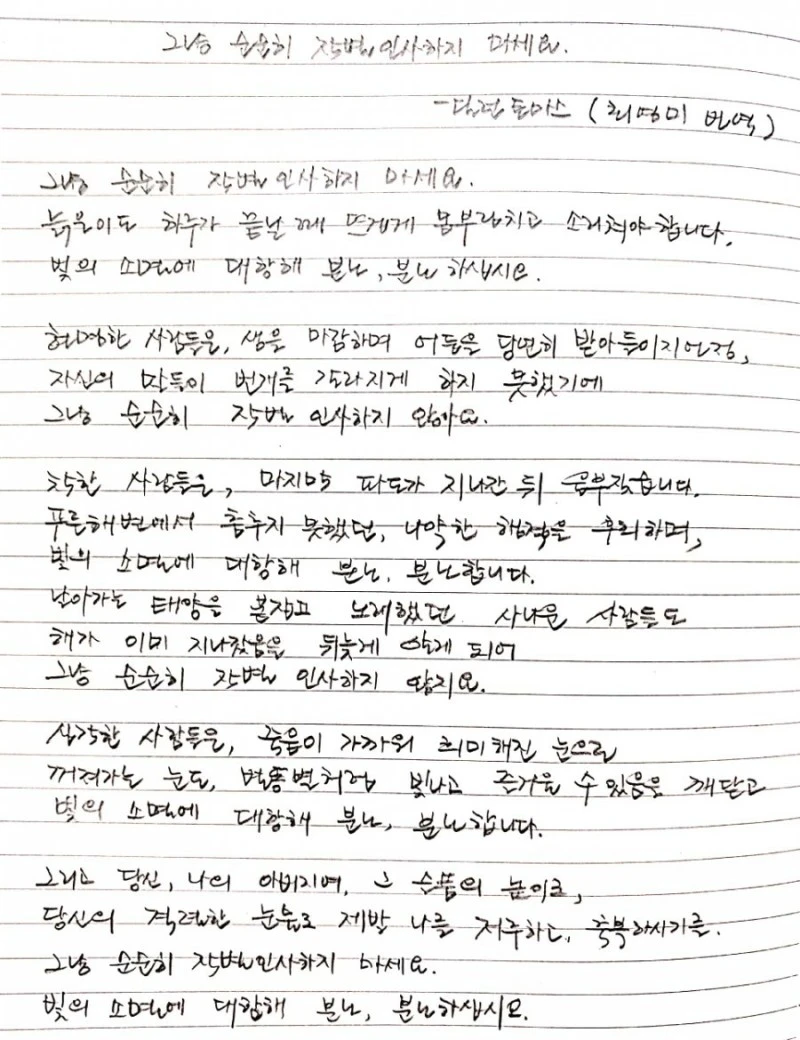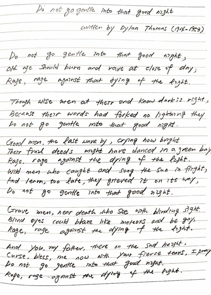 And you, my father, there on the sad height, Curse, bless, me now with your fierce tears, I pray. Do not go gentle into that good night. 그리고 당신, 나의 아버지여, 그 슬픔의 높이로, 당신의 격렬한 눈물로 제발 나를 저주하고, 축복하시기를 그냥 순순히 작별인사하지 마세요. 빛의 소멸에 대항해 분노, 분노하십시오.