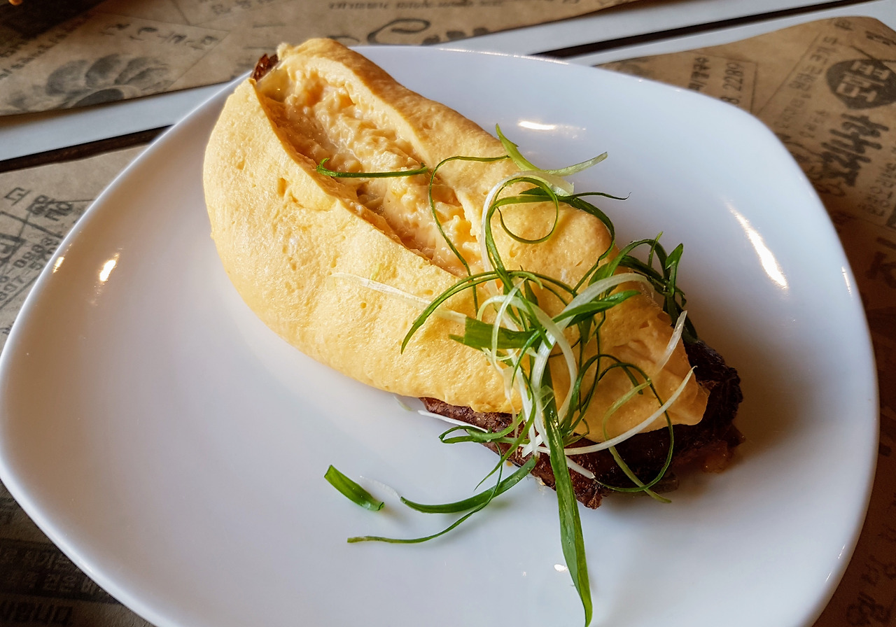식당 안은 대량 10개의 테이블이 준비되어 있어 움직임이 불편할 정도로 좁다. 그래도 식당에서 가장 기본적인 것은 역시 맛, 손님들이 줄 서서 먹는다는데 이런 불편함은 큰 문제가 아니다. 일찍 도착해서 그런지 아직 상을 정리 중에 있었고 곧 문을 열자마자 딱 두 개 있는 제일 큰 상을 차지했다. 메뉴는 단출하게 몇 개 없다. 기본적인 것을 빼고 보면 육회, 삼겹살 구이, 김치볶음밥, 오믈렛 그리고 갈비찜 이렇게 있다. 가격은 대략 10불 정도 된다. 메뉴판에서 가장 눈에 띄는 것은 일반적인 한식당과 달리 반찬을 따로 판다는 것.