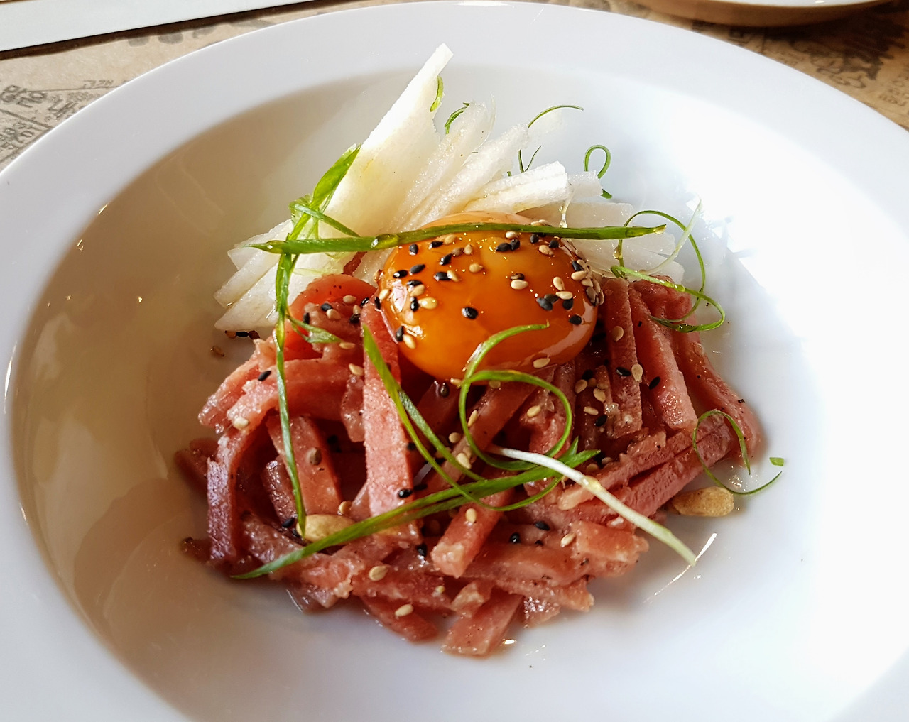시식메뉴는 한 사람당 따로 나오는 것이 아니라 그냥 한 접시가 나오는 것이어서 서로 나눠 먹어야 한다. 하여간 주요리는 먼저 육회가 나왔는데 색도 예쁘고 아주 맛 좋다. 두 번째 요리 삼겹살은 보드라운 살과 살짝 매콤한 고추장이 곁들여져 우리 한식이 이렇게 고급 요리가 될 수 있구나 하는 자긍심을 주는 요리였다. 세 번째 김치볶음밥과 오믈렛은 진한 육수와 김치가 잘 어우러져 우리 한인이 딱 좋아하는 음식이자 브라질 사람 입맛에도 맞는 리조또와 비슷하다.
