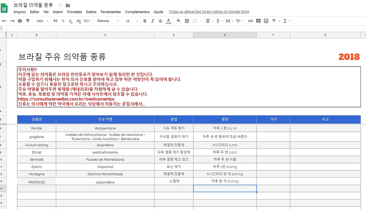 여러 작업 중 이번에 올리는 링크는 브라질에서 많이 사용하는 의약품 리스트입니다. 평소 아프지 않으면 잘 모르는 의약 정보. 또 요즘 온라인 판매로 가격 비교도 중요합니다.