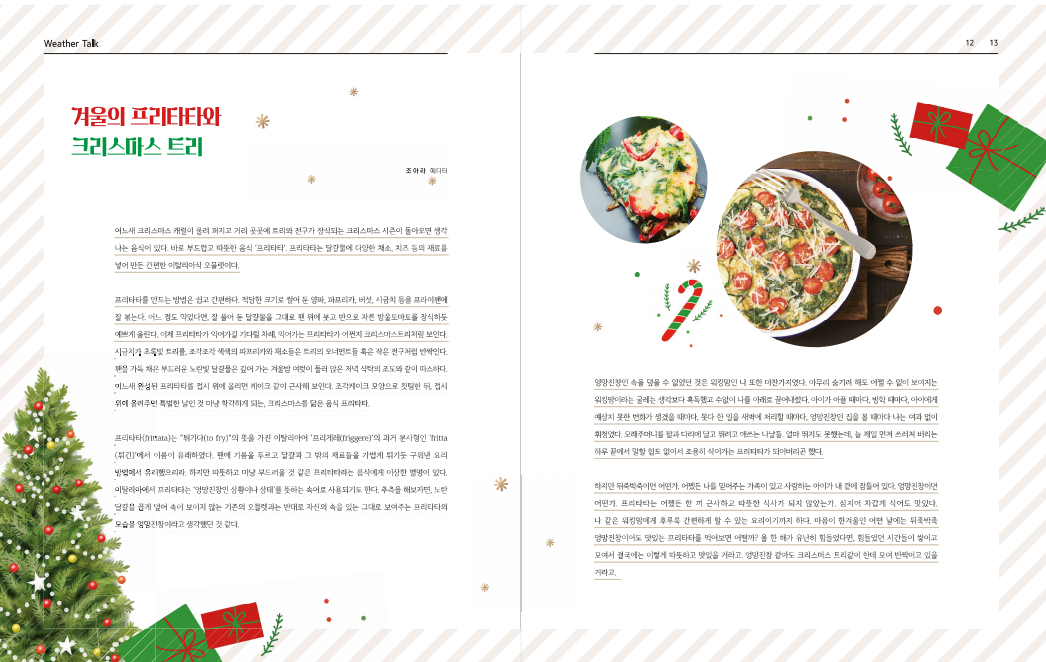 하지만 뒤죽박죽이면 어떤가. 어쨌든 나를 믿어주는 가족이 있고 사랑하는 아이가 내 곁에 잠들어 있다. 엉망진창이면 어떤가. 프리타타는 어쨌든 한끼 근사하고따뜻한 식사가 되지 않았는가. 심지어 차갑게 식어도 맛있다. 나 같은 워킹맘에게 후루룩 간편하게 할 수 있는 요리이기까지 하다. 마음이 한겨울인 어떤 날에는 뒤죽박죽 엉망진창이어도 맛있는 프리타타를 먹어보면 어떨까? 올 한 해가 유난히 힘들었다면, 힘들었던 시간들이 쌓이고 모여서 결국에는 이렇게 따뜻하고 맛있을 거라고. 엉망진창 같아도 크리스마스 트리같이 한데 모여 반짝이고 있을거라고.