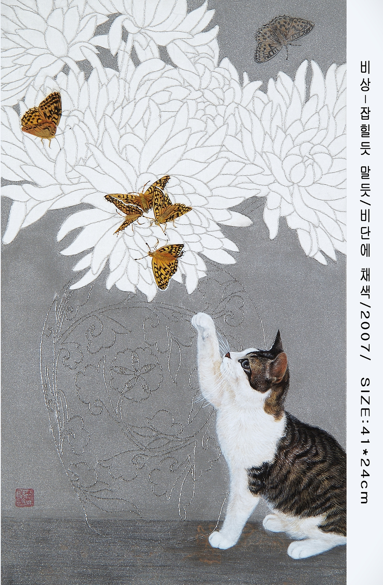 선을 이용해 양감을 표현하는 동양화 기법을 쓰지만 결국 재료와 소재의 차별화다. 아주 예민한 전통 비단 위에 분채와 아교 그리고 물이라는 재료를 가지고 한국화의 초상화 기법을 고양이를 통해 극대화할 때 나만의 독특한 작품이 탄생하게 된다. 분채를 활용한 작업은 쉽지 않다. 하지만 분채를 쓸 때만 살아 숨 쉬는 듯한 고양이가 표현된다.