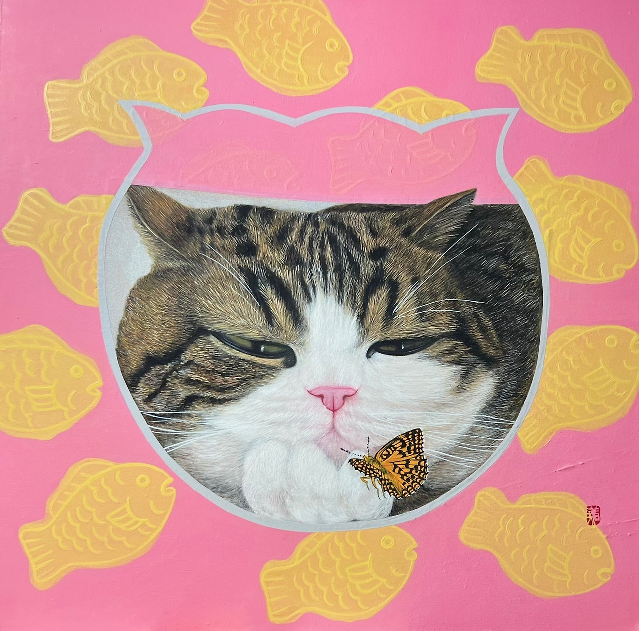 꿈꾸는 고양이 #3_미식의 향연, 34 cm×34cm/실크에 혼합재료/2022