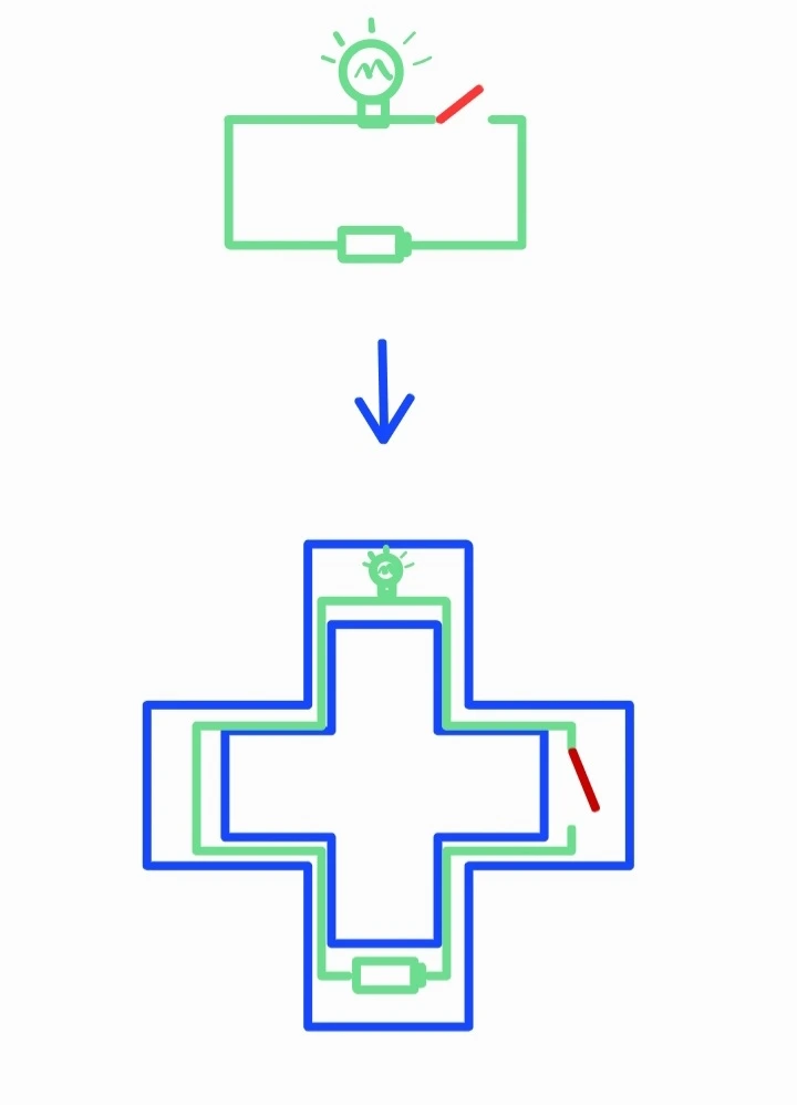 예를 들어 제일 처음의 전구 회로를 다음과 같이 십자가 모형의 틀에 넣어야 한다고 가정해 보자. 그럼 각 요소별 연결 포인트는 동일하지만 각각의 배치 위치와 도선의 모양이 바뀌는 것을 볼 수 있다.