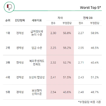 임금수준은 물론 급여정보와 논의수준, 보상의 합당성, 보상절차의 신뢰수준이 모두 낮았습니다.