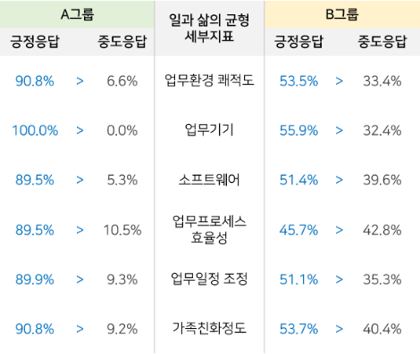 이 두 그룹은 일과 삶의 균형 영역 전반에서 중도응답보다 긍정응답이 높은 패턴을 보였습니다.