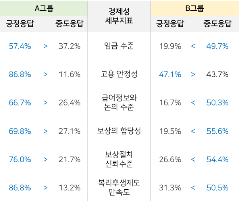 A그룹은 경제성 영역에서 모두 긍정응답이 우세한 반면, B그룹은 고용 안정성을 제외하고 긍정응답보다는 중도응답이 우세했습니다.
