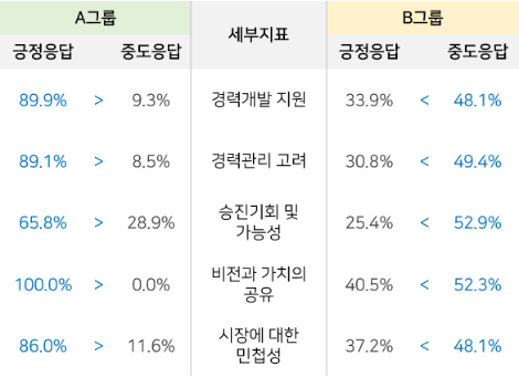 특히 비전과 가치 공유에 대한 질문에 A그룹은 모두 긍정응답을 나타내며 B그룹과 큰 차이를 보였습니다.