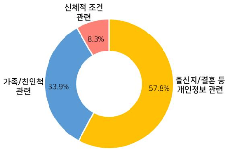 '출신지/결혼 등 개인정보 관련' 질문이 57.8%로 가장 많았고, '가족/친인척 관련' 질문이 33.9%, '신체적 조건 관련' 질문이 8.3%의 비율을 차지했습니다. 특히 '출신지/결혼 등 개인정보 관련' 질문에서는 혼인 여부는 물론 출산(자녀), 애인 유무, 출신 학교, 종교, 흡연 유무 등 업무 연관성이 낮은 요소에 대한 질문이 이어졌는데요. '가족/친인척 관련' 질문에서는 부모님의 직업을 묻는 질문이 가장 많았고, '신체적 조건 관련' 질문에서는 키, 몸무게 외에 외모 평가, 나이에 대한 지적을 주로 하셨습니다.(쩝)