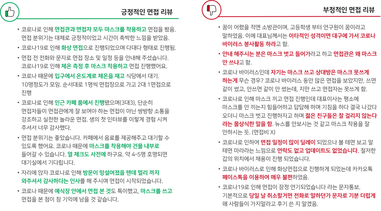 마스크 착용을 했지만, 누구는 쓰고 누구는 안 쓰는 모습도 지원자에게 반감을 사게 했습니다. 그 외에도 면접 일정이 연기되었지만 지원자에게 아무런 연락을 하지 않아 마냥 기다리게 하여 갑질을 당한 것 같은 느낌을 주기도 했고, 화상면접을 하는데 무료 메신저로 진행하여 원활하지 못한 커뮤니케이션이 이어지기도 했습니다. 부정적인 리뷰들의 공통점을 꼽자면, '안 하느니만 못하다'라는 생각을 들게 합니다.
