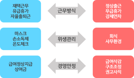 재택근무, 유급휴가, 자율출퇴근 등 비상 상황에 따라 근무형태를 유연하게 변경한 기업이 있는 반면,