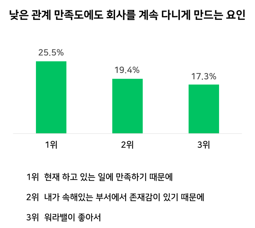 - 좀 더 깊게 파고들어가서 이번엔 동료/상사에 대한 만족도가 낮음에도 불구하고(평균 2점대 이하) 재직하게 만드는 요인 TOP 3를 살펴보았습니다.