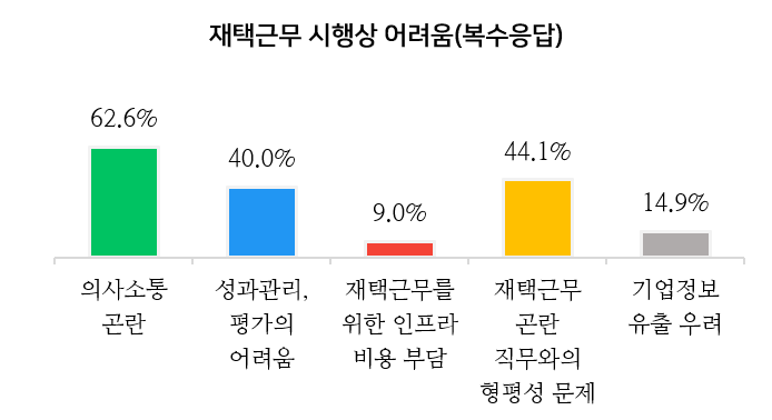 반면, 재택근무 시행의 어려움으로는 ‘의사소통 곤란’(62.6%)이라는 답변이 가장 많습니다. 이어 ‘재택근무가 어려운 직무와의 형평성 문제’(44.1%), ‘성과 관리ㆍ평가의 어려움’(40.0%), ‘기업 정보 유출 우려’(14.9%), ‘재택근무 인프라 비용 부담’(9.0%) 순으로 나타났는데요.