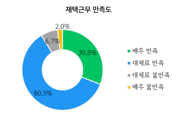 재택근무로 업무효율이 높아졌다는 응답도 73.9%나 되었고요. 재택근무의 긍정적인 효과에 대해 ‘출퇴근 스트레스 해소’(86.0%), ‘여가 확보로 삶의 질 향상’(36.5%)을 꼽기도 했습니다. 아무래도 의사소통 곤란 등 부작용보다는 출퇴근 시간 경감, 업무 집중도 향상 등 긍정적 효과가 큰 것으로 보입니다.