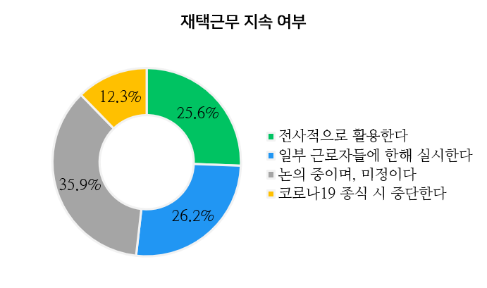 코로나 19 종식 이후에도 '재택근무를 전사적으로 활용한다'(25.6%), '일부 근로자들만 실시한다'(26.2%)로 재택근무를 계속 시행할 것이라고 답한 인사 담당자는 51.8%에 달했습니다.