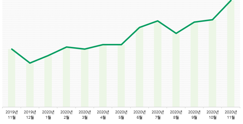 팬데믹 이전에도 여러 기업에서 채용 전형의 일부를 비대면으로 진행하고 있었습니다만 코로나 19의 어마 무시한 확산세로 언택트 채용이 불가피한 대안으로 떠오를 수밖에 없게 되었죠. 실제로 지난 1년간 언택트 채용과 관련한 면접 후기 추이를 살펴봤더니 옆의 그래프처럼 우상향 하는 모습을 보이고 있었습니다.
