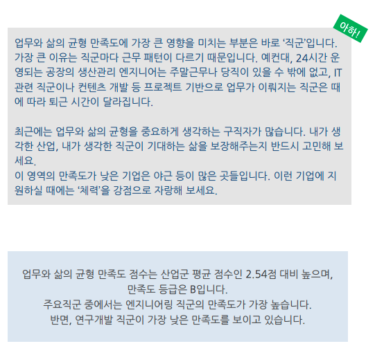 당장 합격하는 것도 중요하지만 입사 후에도 감당할 수 있는 근무 조건인지 알고 지원하는 것이 중요합니다. 특히 사내 문화의 특성, 업무와 삶의 균형 수준 등은 지원자가 자기소개서 상에 이 회사와 얼마나 적합한 인재인지 드러낼 수 있는 보이지 않는 기준이 되기도 합니다. 인사팀 입장에서는 자유로운 우리 회사 분위기와 사뭇 다른 보수성을 가진 지원자나, 많은 업무량을 견뎌낼 수 있을지 의심스러운 지원자를 선뜻 합격시키키 어려우니까요.