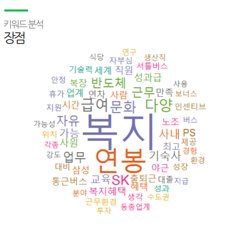 키워드 분석은 잡플래닛에 등록된 SK하이닉스 전·현직들이 남긴 리뷰를 키워드로 분석하여, 한 눈에 기업의 장·단점을 알아볼 수 있도록 나타낸 데이터입니다.
