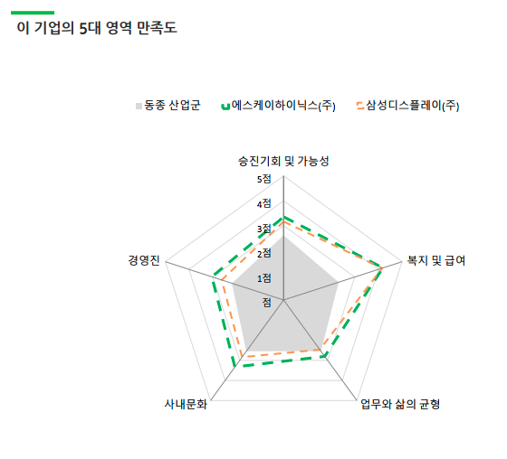 SK하이닉스 세부 평가 영역은 승진 기회 및 가능성 / 복지 및 급여 / 업무와 삶의 균형 / 사내 문화 / 경영진