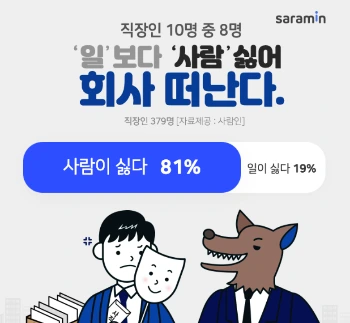 설문에 참여한 직장인 379명 중 81%가 일보다 '사람'이 퇴사에 영향을 더 크게 미친다고 대답했으며, 업무 시에는 업무 관련 스트레스보다 인간관계 스트레스가 크다고 대답한 것입니다.