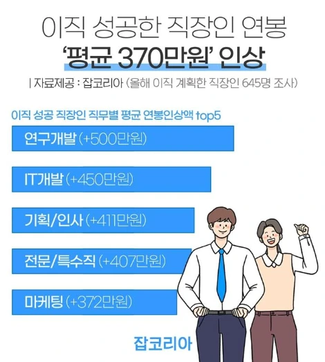 특히 상반기 이직자 중 가장 높은 연봉 상승률을 차지한 직무는 '연구개발' 직무에 해당하는 직장인인데요. 이들은 평균 500만 원 이상의 연봉이 상승되어 모든 직무 중 인상폭이 가장 컸습니다.