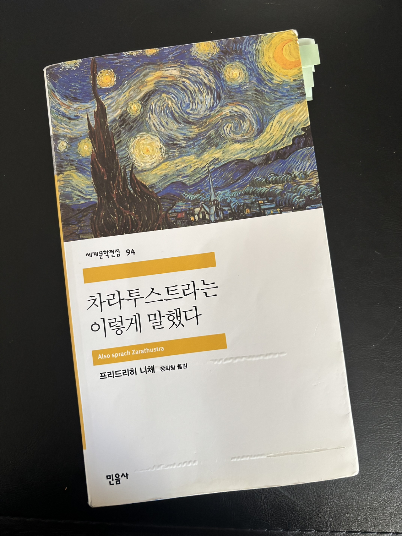 그렇게 시간이 흐르고 흘러 중고 서점에서 결국 책을 사두고서는 비장하게 읽어 보겠다고 펼치고서는 늘 차라투스트라가 산 위에서 내려오는(이 책의 극 초반) 장면에서 그만 두곤 했었다. 마치 글자를 읽고 있지만, 글자만 읽고 뭘 말하는지 이해 못 하는 괴로운 느낌이 들었기 때문이다. 분명히 글을 이해하는데 이해하지 못하겠던 그 느낌. 그래도 이 명저를 읽어야 무언가 내가 원하는 내가 될 것 같은 욕망 때문에 다른 출판사의 새 책을 구매해서 다른 번역을 읽어 보기도 했지만 마찬가지로 차라투스트라가 산 위에서 내려오면서 책을 덮어 버리곤 했었다.