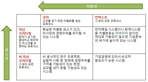 다만 기업의 다양한 업무를 '코어/콘텍스트'라는 기준으로만 양분하기에는 한계가 있습니다. 제프리 A. 무어는 '코어/콘텍스트'와 더불어, '미션크리티컬/비미션크리티컬'이라는 또 하나의 기준을 제시했습니다.