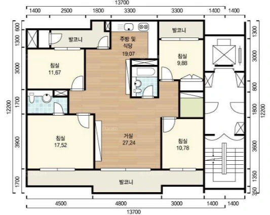 다음 그림은 아파트의 특정 가구에 대한 설계도이다. 이 설계도는 개별 세대의 방구조와 배치, 동선 등을 표현하는 좀 더 세부적인 아키텍처에 해당한다. 또한 전문적인 기호와 수치는 또 다른 이해관계자(설계자, 시공업자 등)를 위해 제공되는 정보로서 상세한 설계 기준으로 사용된다.