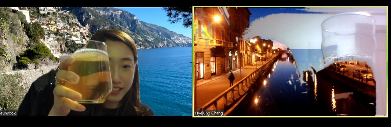 문제 정의 이후에 저희는 온라인 혼술 클럽을 한번 진행해보았습니다. 제 컴퓨터 사양이 낮아서인지, 배경이 지저분해서인지 아래 사진의 우측처럼 배경에 제 얼굴이 믹싱 되어 자체 아바타가 알아서 만들어지는 현상도 있었습니다. 이탈리아 여행으로 자연스럽게 주제가 흘러갔는데 그때 찍은 사진을 바로 배경으로 공유하면서 이야기를 생동감 있게 이어나가는 재미가 있었습니다.