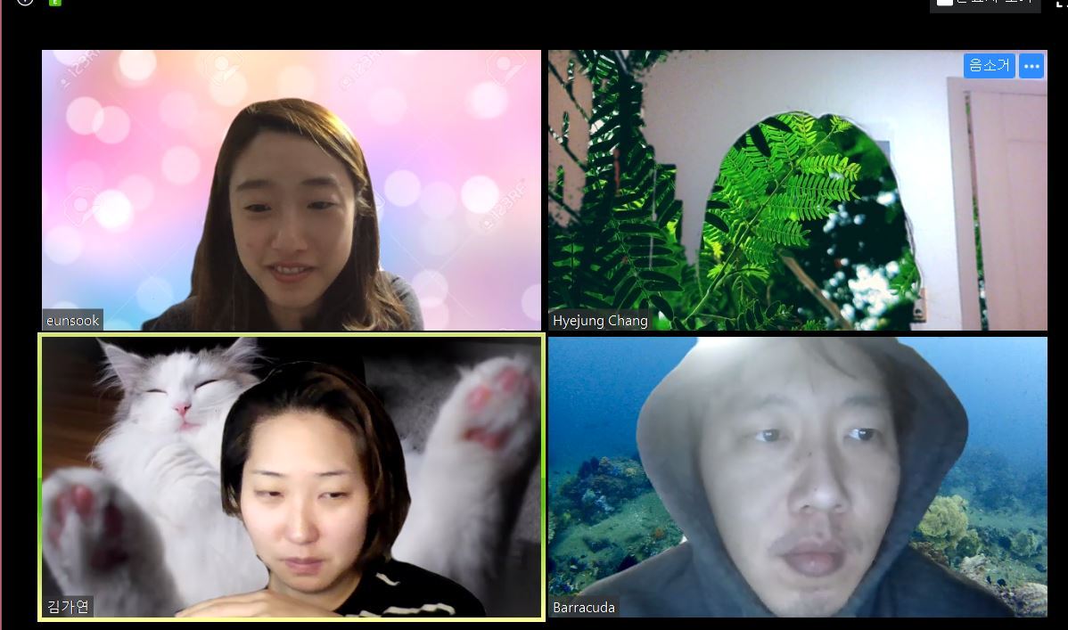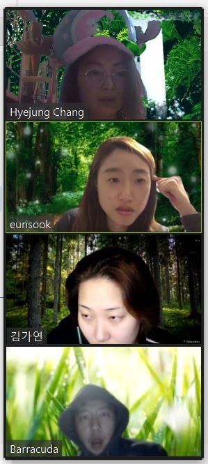 오프라인에서 브레인스토밍과 인터뷰를 통해 '원격 화상 커뮤니티'에 대한 이해와 관찰을 한 저희는 온라인 화상 회의를 통해 프로젝트 진행을 계속하게 됩니다. 화상회의 툴 줌(zoom)을 이용했죠. 아는 얼굴들인데도 처음에는 쑥스러웠습니다. 온라인에서만 할 수 있는 재미를 활용하기 위해 저희는 모두 배경화면을 바꿔보았습니다. 처음에는 각자 좋아하는 이미지를 활용하다가 한번 모두 통일된 배경을 사용하면 어떨까 의견이 나와 다들 '숲'을 주제로 바꿔보았어요. 온라인에서는 서로 다른 공간에 있다는 느낌이 강했었는데, 숲으로 배경을 통일하고 나니 모두 함께 숲 속에서 산림욕을 느끼며 대화하는 기분이 들었습니다.
