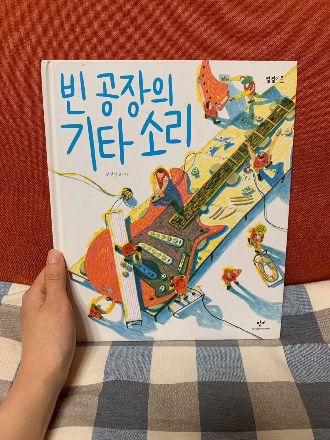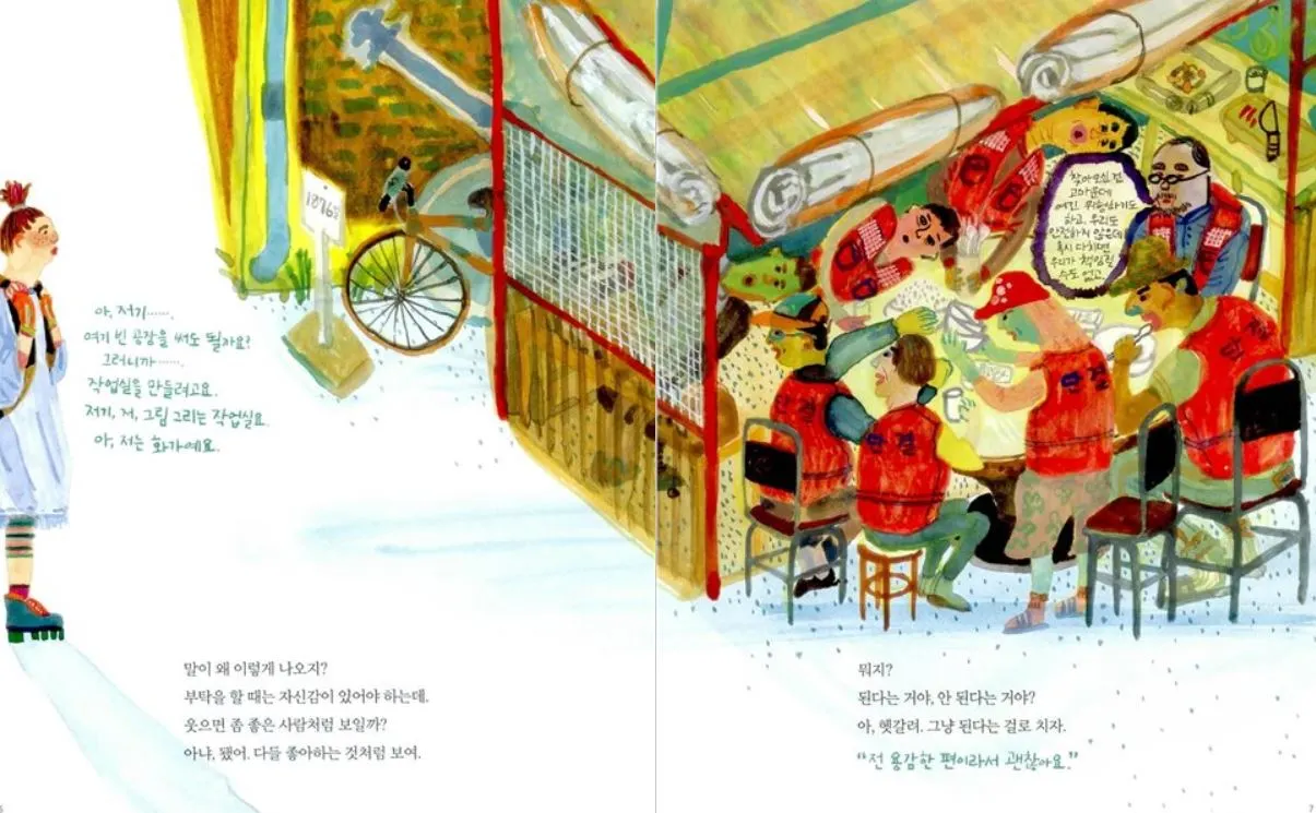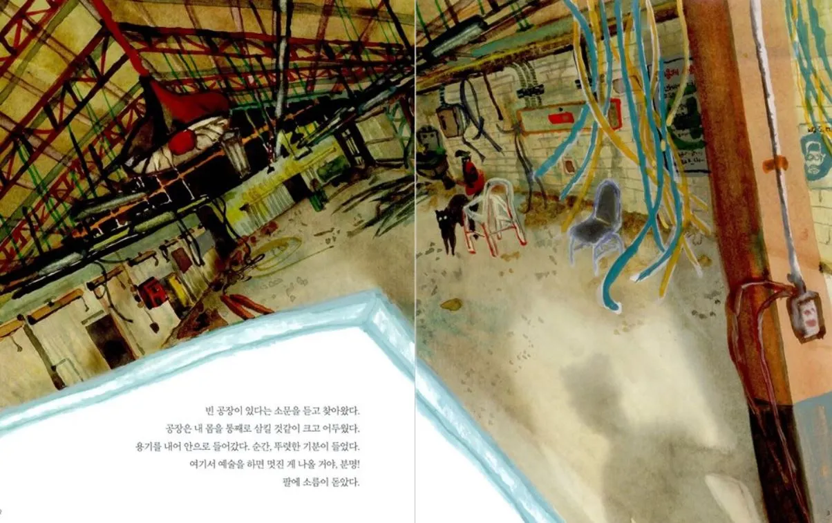 전진경 작가님의 <빈 공장의 기타 소리>는 인물들의 익살스러운 표정과 몸짓, 그리고 다채로운 색깔은 시종일관 시종일관 밝고 명랑합니다. 하지만 내용을 찬찬히 따라가다 보면 해고된 노동자들이 빈 공장에서 투쟁을 하고 있는 내용이 진중하죠.