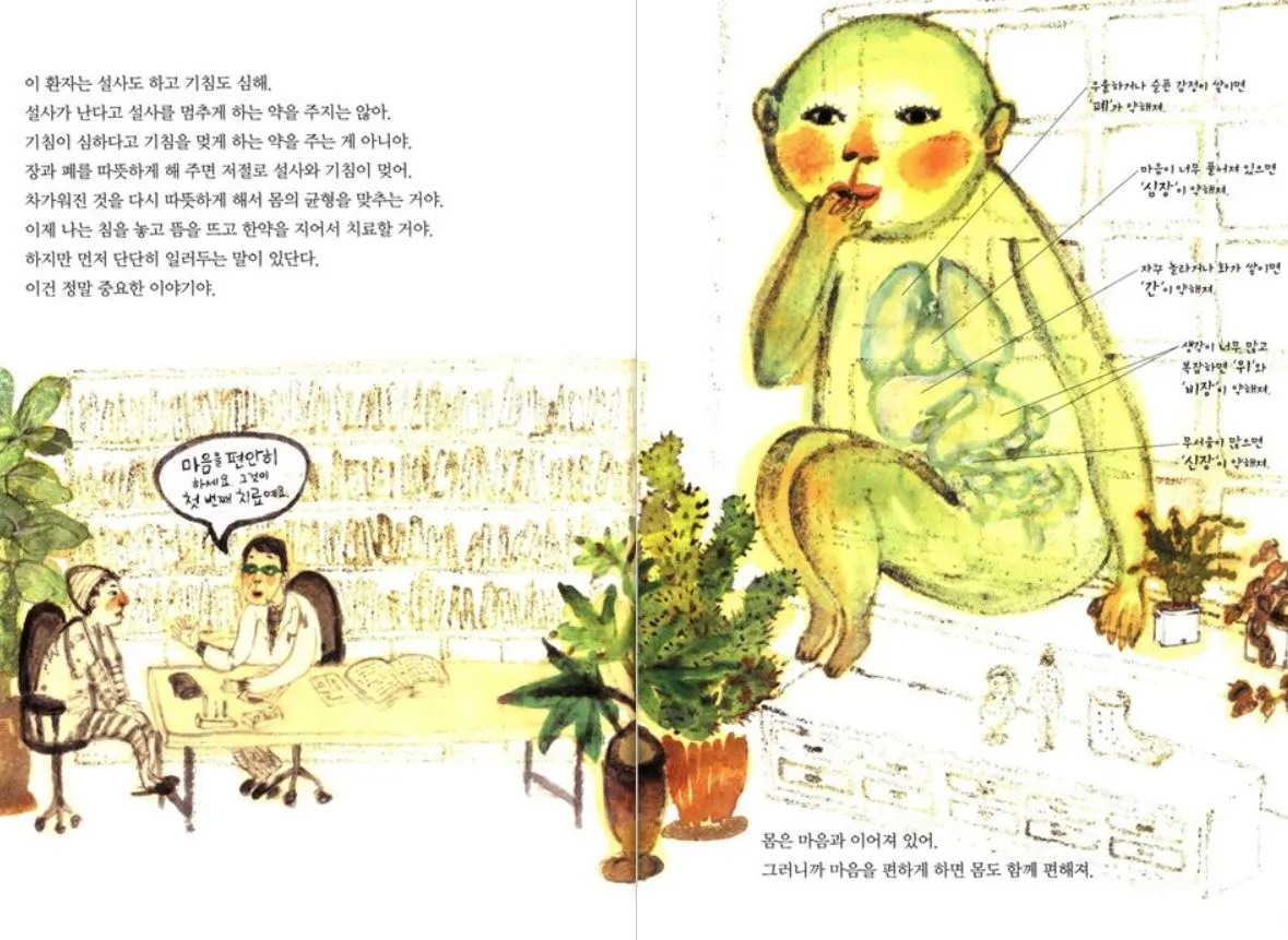 독특하고 개성 넘치는 전진경 작가님의 그림의 매력을 느낄 수 있는 또 다른 책으로 <맥을 짚어 볼까요?>가 있습니다. 한의원을 찾는 수많은 사람들, 그들을 관찰하고 맥을 짚고 침을 놓고 약을 처방하는 한의사 선생님. 실제 한의사를 취재한 내용을 기반으로 구성된 책에는 한가할 때 요가를 하는 한의사 선생님의 일과를 볼 수 있는 것은 물론 한약의 종류, 몸이 아플 때의 지압 방법 등 한의학과 관련된 알찬 정보도 담겨 있습니다. 물감과 달걀노른자를 섞어서 그려 독특한 색감이 느껴집니다.