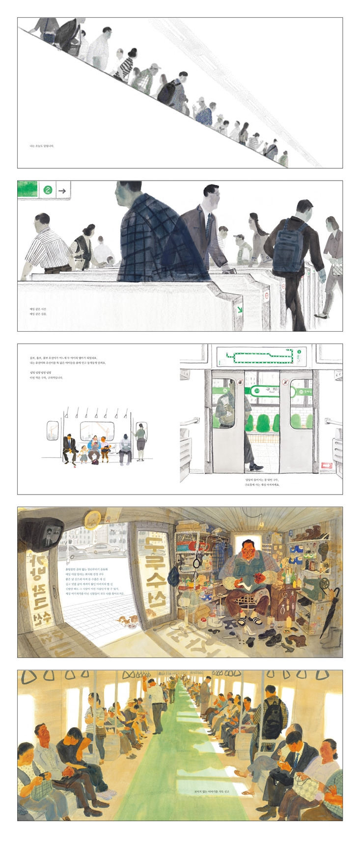 이 책의 화자는 지하철입니다. "이번 역은 합정, 합정역입니다." 라며 역 소개를 하기도 하고, 덜컹덜컹 몸을 흔들며 사람들을 맞이합니다. 따뜻한 시선으로 탑승하는 승객을 자세히 관찰하고 반갑게 맞이하는 지하철, 그리고 각자의 사연을 갖고 지하철에 탑승하게 된 사람들. 지하철과 사람들의 만남이 단순히 목적지를 가기 위한 수단이 아니라 다양한 삶이 펼쳐지는 하나의 스테이지처럼 느껴집니다.