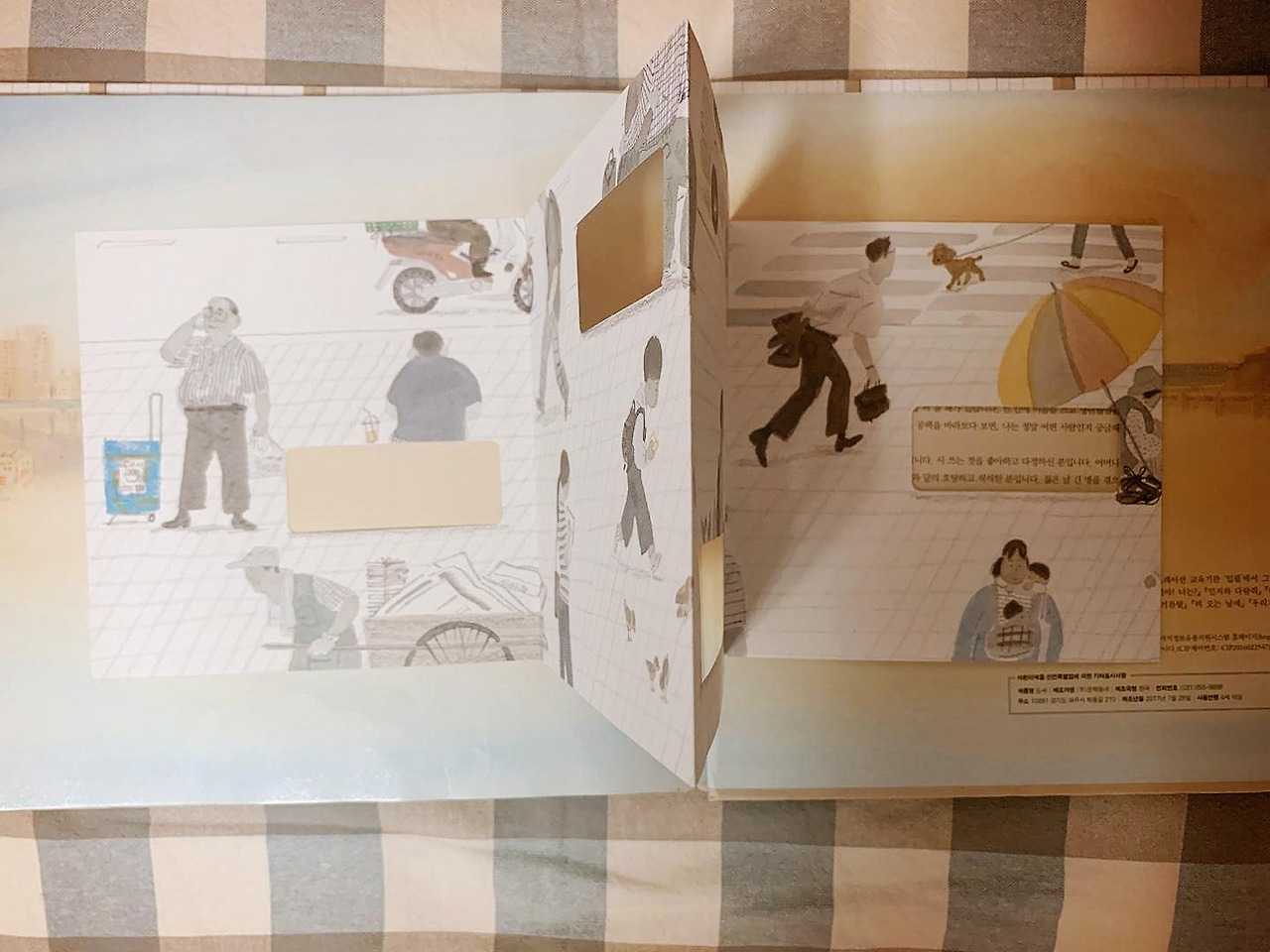 책 마지막에 붙어 있는 별책 스토리북은 책 안에서 다뤄진 인물들의 모놀로그가 담겨있습니다. "나는 정유선입니다" "나는 구공철입니다" 등으로 이어지는 이야기를 읽으며, 책 안에 담긴 이야기가 작가의 상상이 아니라 실제로 사람들의 일상을 그대로 반영했다는 생각을 하게 됩니다. 아코디언 형식으로 접히고, 앞면은 그림, 뒷면은 글로 구성하되 인물의 얼굴이 글에서 보이도록 구멍을 낸 아이디어가 작은 독립출판물을 보는 재미를 줍니다.
