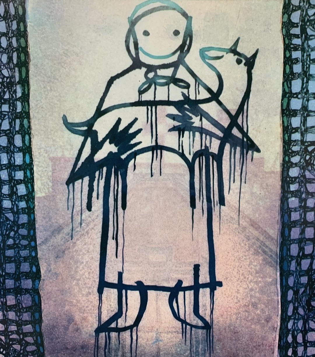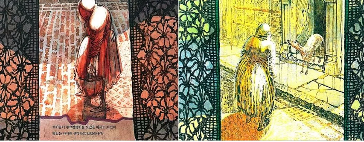 <창 너머>에는 바깥을 훔쳐보는 소년의 음울한 표정을 비롯해서, 쭈그렁탱이, 삐쩍 마른 개 등 삭막한 현실의 풍경을 담고 있습니다. 하지만 스테인글라스의 빛처럼, 고흐의 거친 붓놀림의 색처럼 강렬한 색상은 계속 보는 이의 시선을 사로잡습니다. 창 너머 소년이 바라보는 풍경은 계속 변합니다. 알프네 과자 가게, 짐마차, 사람들에게 침을 뱉는 조지, 갑작스럽게 하늘로 날라 오르는 비둘기, 쭈그렁탱이 할머니와 비쩍 마른 개.. 3인칭 시점으로 내레이션 되던 창 밖 풍경이 책 중반 이후로 갑자기 소년의 1인칭 시점으로 바뀝니다. 갑작스럽게 비둘기가 하늘로 날아오르고 말은 무섭게 질주합니다. 소년은 슬퍼하며 개를 꼭 안고 가는 쭈그렁탱이의 모습을 유리창에 입김으로 그림을 그립니다.