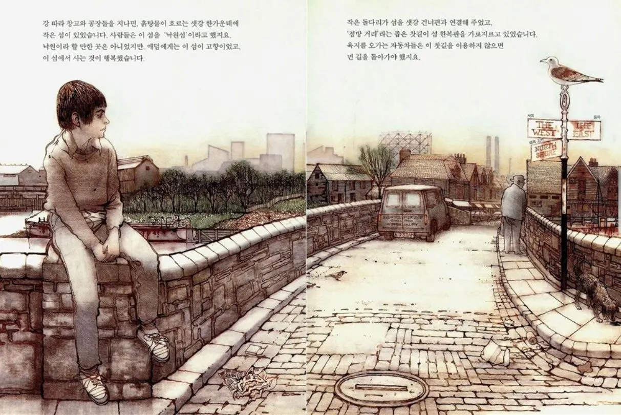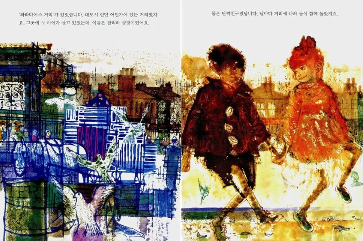 찰스 키핑의 다른 작품 <길거리 가수 새미>와 <낙원섬에서 생긴 일>은 앞에서 소개 한 두 작품과는 달리, 정제된 갈색 톤을 기반으로 특유의 화려한 컬러 사용은 부분적으로 절제해서 표현합니다. 미디어 스타의 이야기를 다룬 <길거리 가수 새미>, 도시 개발로 인한 낙원 섬의 변화를 다룬 <낙원섬에서 생긴 일> 모두 작가의 비판적인 현실에 대한 시각이 담겨 있습니다. 하지만 마냥 부정적인 태도만 취하는 것이 아니라 자그마한 희망의 깃도 발견할 수 있죠. 찰스 키핑의 독창적이고 강한 스타일은 마치 비주류의 마니아층에게만 인정받을 것 같지만, 영국을 대표하는 그림책 작가로 불리고 있습니다.