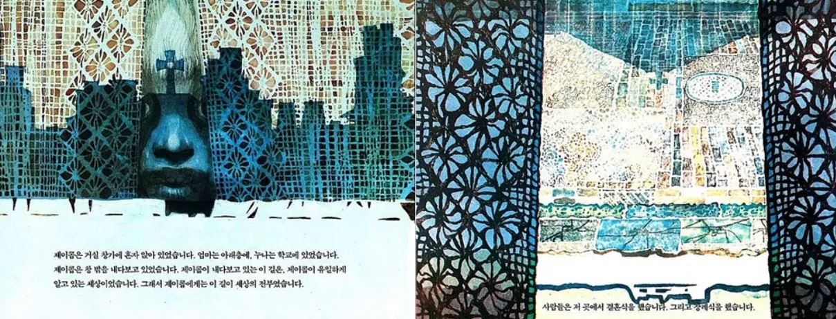<창 너머>에서는 반어법 적인 내용이 가득합니다. 무채색으로 표현해야 어울릴 것 같은 부정적인 현실의 피사체들은 온통 알록달록한 채색으로 아른거립니다. 창문 커튼 사이로 바라본 풍경은 조각조각 몽타주처럼 연결이 되고, 창 밖의 모든 일들은 추측과 상상으로 얼룩집니다. 죽음을 간접적으로 표현하고 있는데도, 직접적으로 설명하는 것보다 더 강하게 느껴지는 이유는 은유적인 상상 때문입니다. 현실에서 일어난 일보다 더 끔찍하고 과격한 상상까지 이끌어 낼 수 있는 거죠. 우울한 소년의 감정이 현실을 더 몽환적으로 만듭니다. 마치 창에 흘러내리는 그림 속 그림 자욱이 흐르는 피를 연상시키는 것처럼 말이죠.