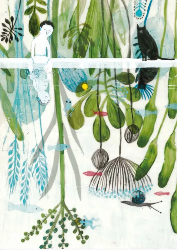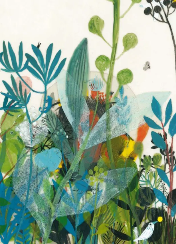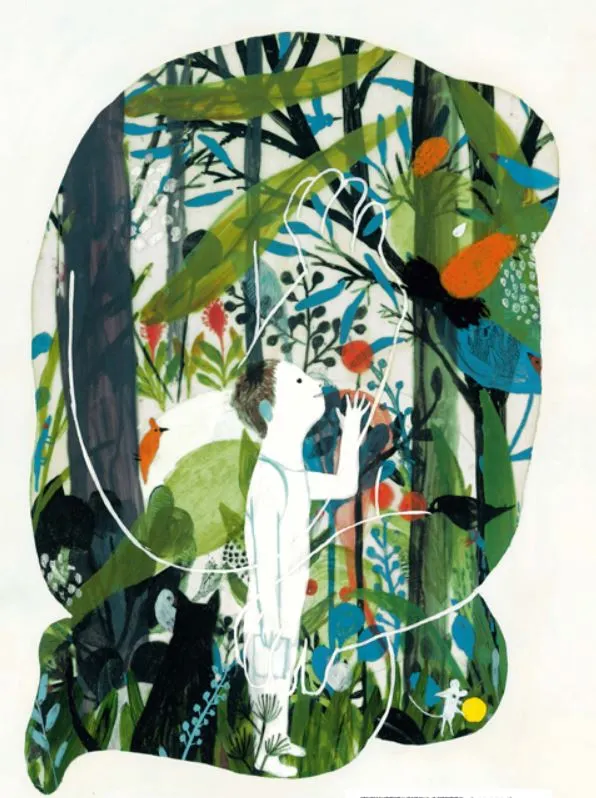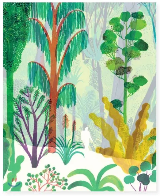 비올레타 로피즈의 수많은 레이어로 구성된 싱그러운 자연의 이미지는 볼 때마다 새로운 발견을 하게 만듭니다. 수많은 나무가 어우러져 숲이 되는 것처럼 하나하나의 개성 있는 오브제를 관찰할 수도 있고, 전체가 어우러진 풍경의 조화도 감상할 수도 있습니다. 이미지 곳곳에 빨간색 동그라미와 노란색 동그라미를 찾아볼 수 있는데, 저는 빨간색 큰 동그라미는 루이 할아버지를, 노란색 작은 동그라미는 소년을 상징한다는 느낌을 받았습니다. 좀 더 자세히 말하자면 그들의 마음이나 생각이라고 표현해도 될 것 같고요. 초록색의 자연의 이미지로 가득한 할아버지의 모습과 달리, 소년은 하얀색입니다. 무엇이든 될 수 있고, 변화될 수 있는 소년의 가능성과 순수함이 흰색과 잘 어울립니다. 소년의 작고 하얀 손은 어떤 형태와 색으로 변하게 될까요.