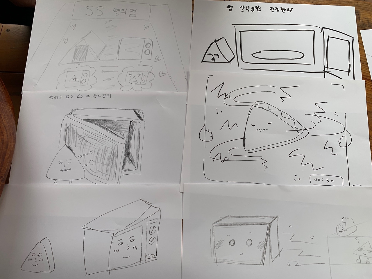 편의점 제품이 서로 썸남썸녀가 되는 상상을 해보았습니다. 썸을 탈 수 있는 공간이 생각보다 다양했어요. 서로의 매장 내 위치에서, 전자레인지 문을 열면서, 전자레인지 안에서 등등. 이번 주제의 그림은 신기하게 6장을 하나의 스토리로 연결시킬 수 있었습니다. 우연한 만남에서부터 전자레인지를 열고 들어가 온기를 느끼고 다시 그 후에도 서로를 생각하는 엉뚱 발랄한 애니메이션 같다고 해야 할까요 ㅎㅎ