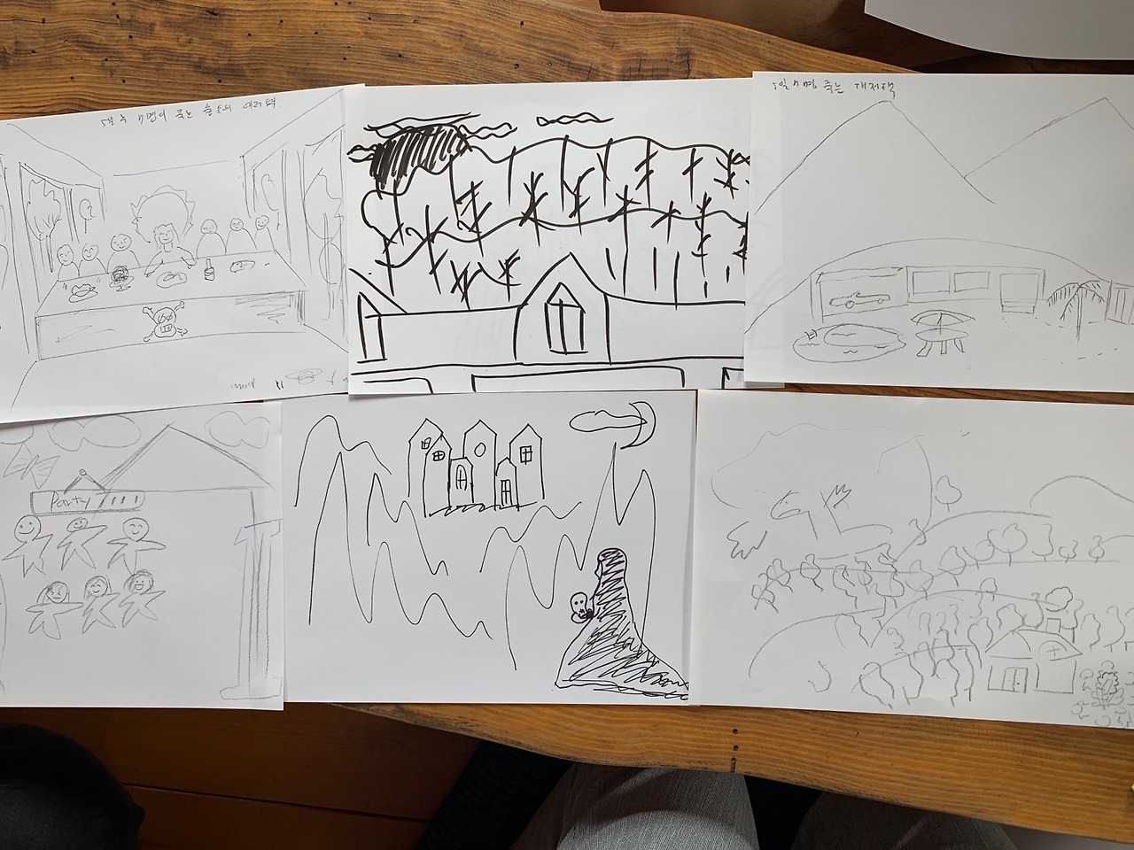 곧 죽음이 닥쳐올 대저택을 어떻게 표현했을까요? 저택에 대한 표현도 각자 생각에 따라 다양합니다. 미국식 리조트도 있고, 유럽식 성도 있고, 최후의 만찬이 생각나는 구도도 있네요. 숲을 표현하는 방식도 흥미롭습니다.